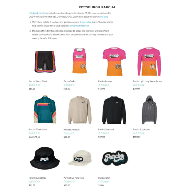A VC Team Store is your team's solution for player-direct ordering and payment for uniforms and team-branded swag, for players and fans alike.